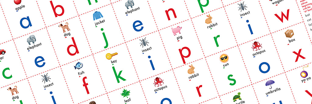 NEW! The entire alphabet on one page each: lower case and upper case letters, plus two pages of fun, colorful emoji that cue each letter sound.